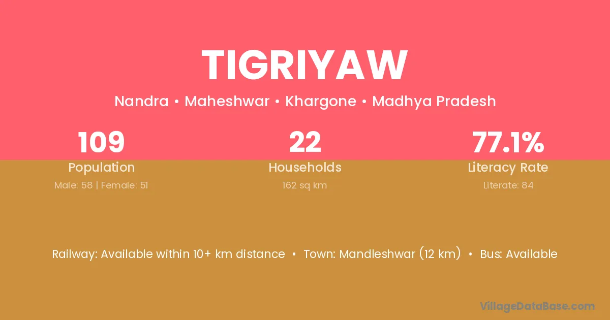 Mandleshwar (12 km) is the nearest town to Tigriyaw village for major economic activities and is located approximately 12 km away.