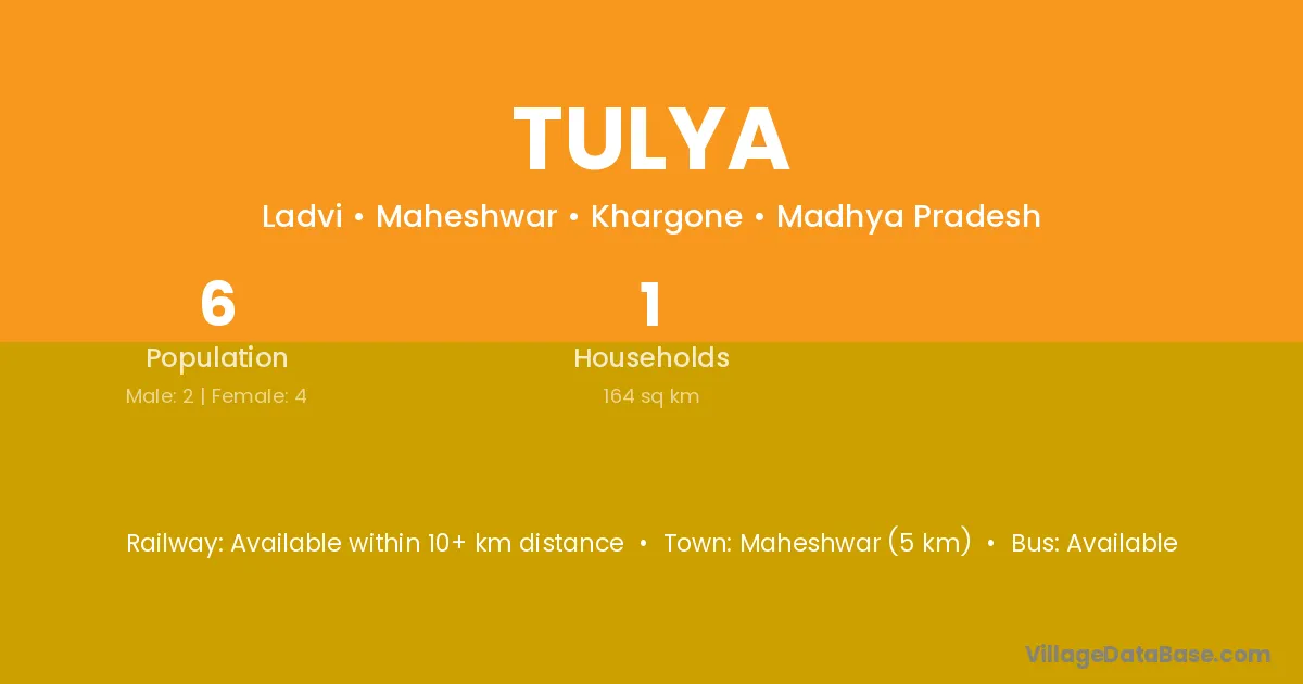 Maheshwar (5 km) is the nearest town to Tulya village for major economic activities and is located approximately 5 km away.