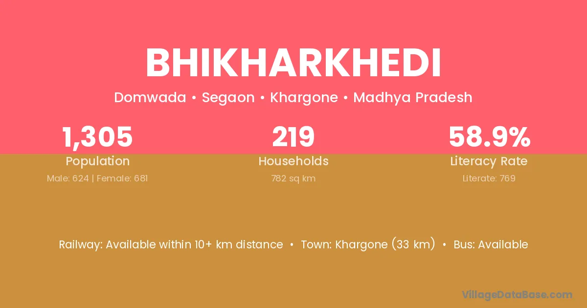 Khargone (33 km) is the nearest town to Bhikharkhedi village for major economic activities and is located approximately 33 km away.