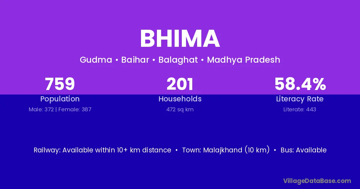 Bichhiya (15 km) is the nearest town to Bhima village for major economic activities and is located approximately 15 km away.