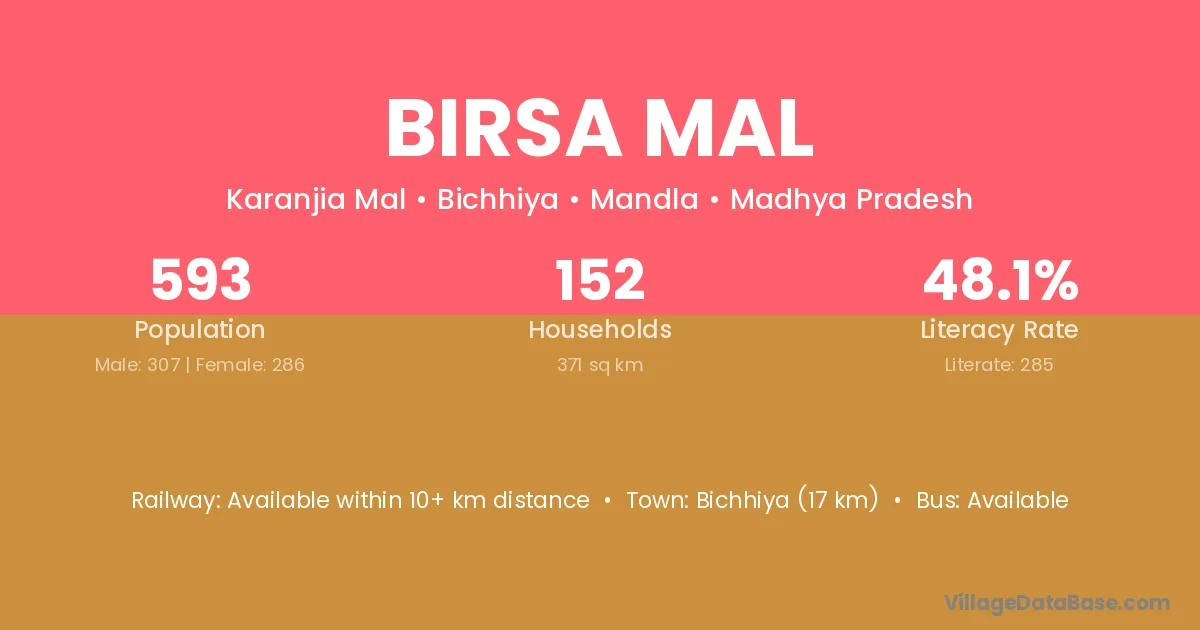 Birsa Mal village has a total population of 593 people, of which 307 are males and 286 are females.