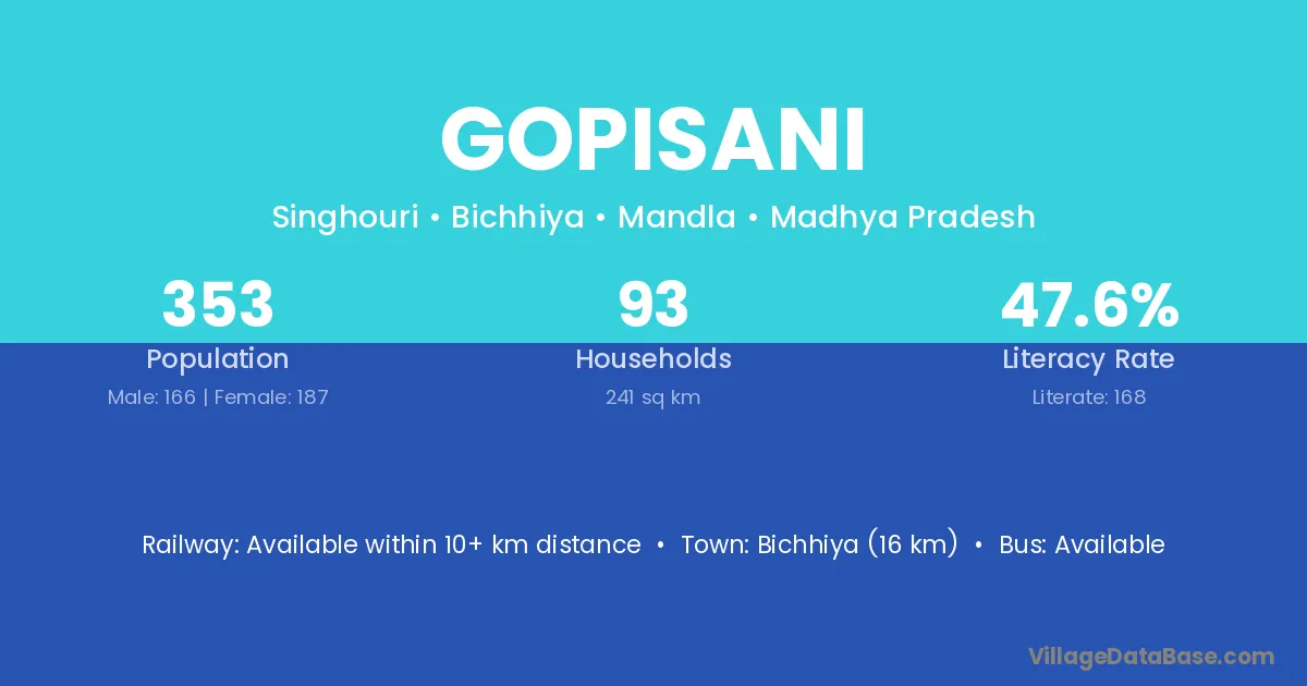 Bichhiya (16 km) is the nearest town to Gopisani village for major economic activities and is located approximately 16 km away.