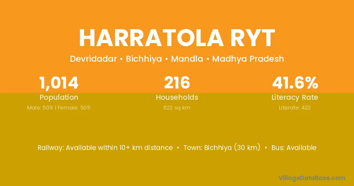 Bichhiya (30 km) is the nearest town to Harratola Ryt village for major economic activities and is located approximately 30 km away.