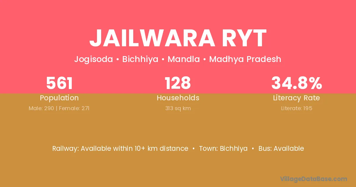 Jailwara Ryt village has a total population of 561 people, of which 290 are males and 271 are females.