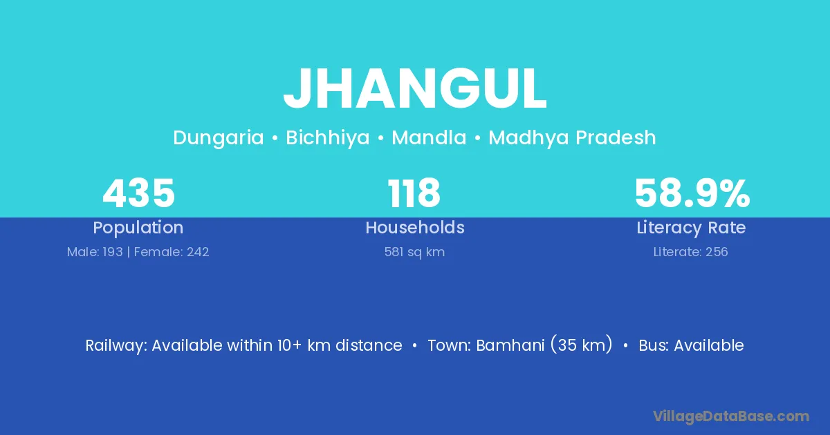 Jhangul village has a total population of 435 people, of which 193 are males and 242 are females.