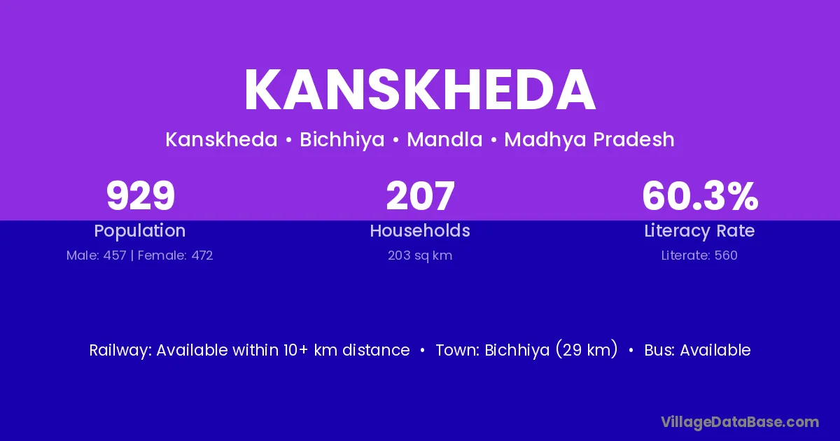 Kanskheda village has a total population of 929 people, of which 457 are males and 472 are females.