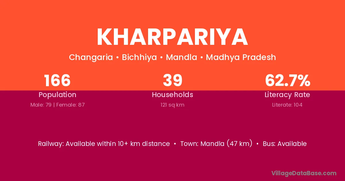Mandla (47 km) is the nearest town to Kharpariya village for major economic activities and is located approximately 47 km away.