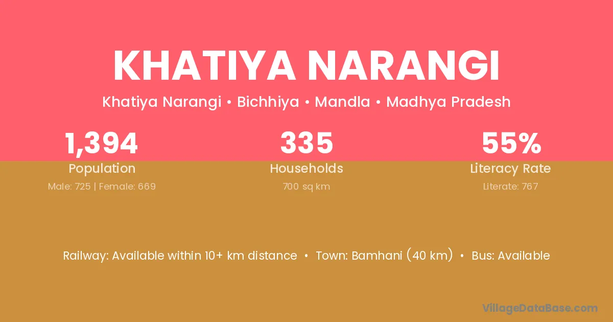 Bamhani (40 km) is the nearest town to Khatiya Narangi village for major economic activities and is located approximately 40 km away.