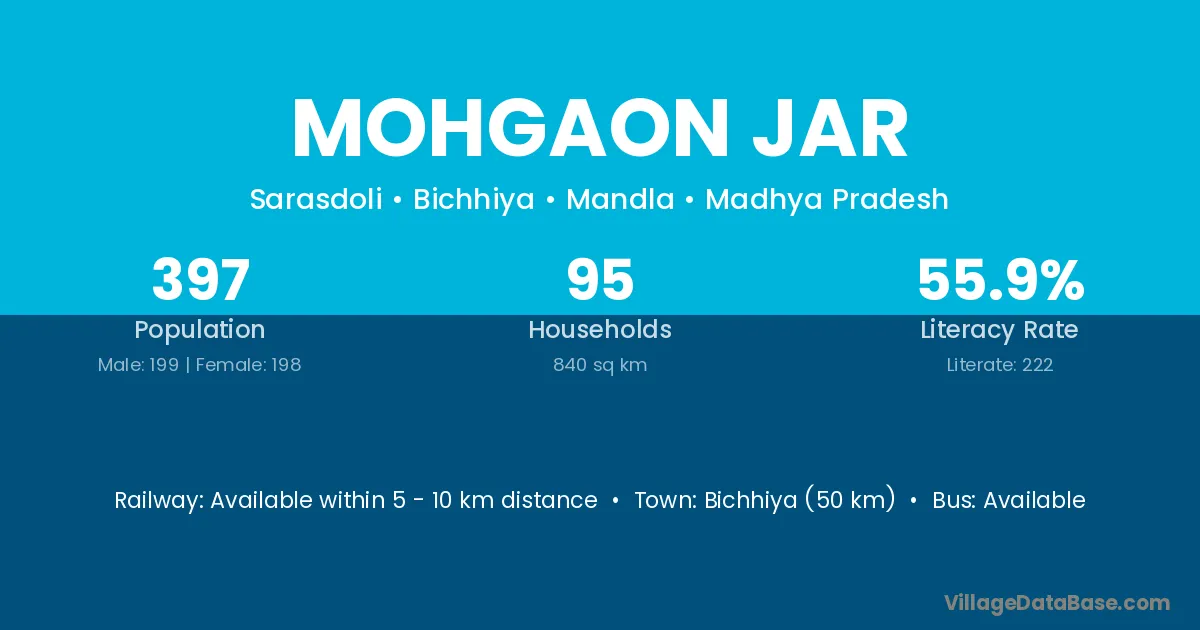 Bichhiya (50 km) is the nearest town to Mohgaon Jar village for major economic activities and is located approximately 50 km away.