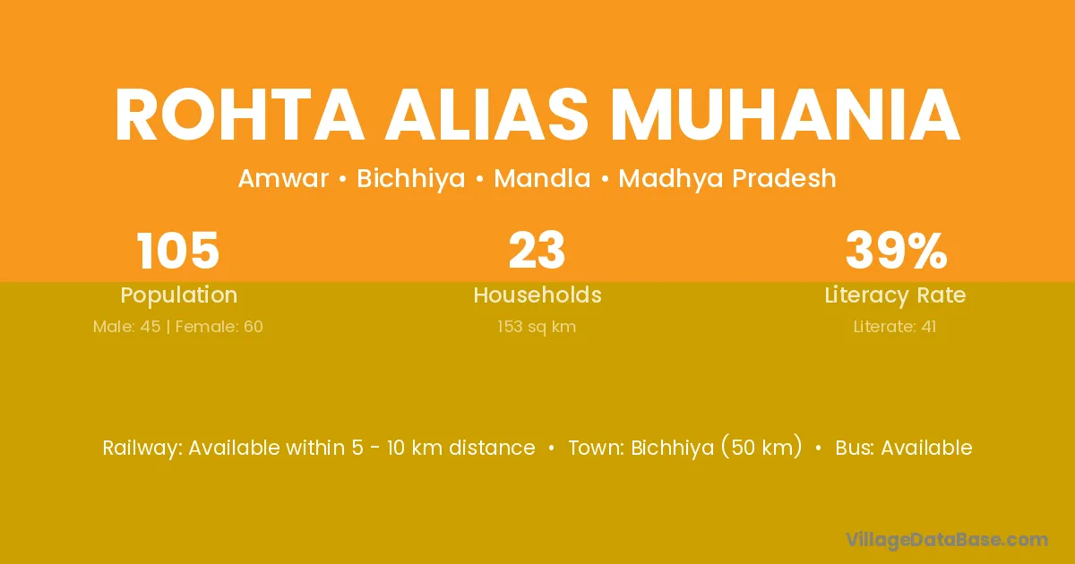 Bichhiya (50 km) is the nearest town to Rohta Alias Muhania village for major economic activities and is located approximately 50 km away.