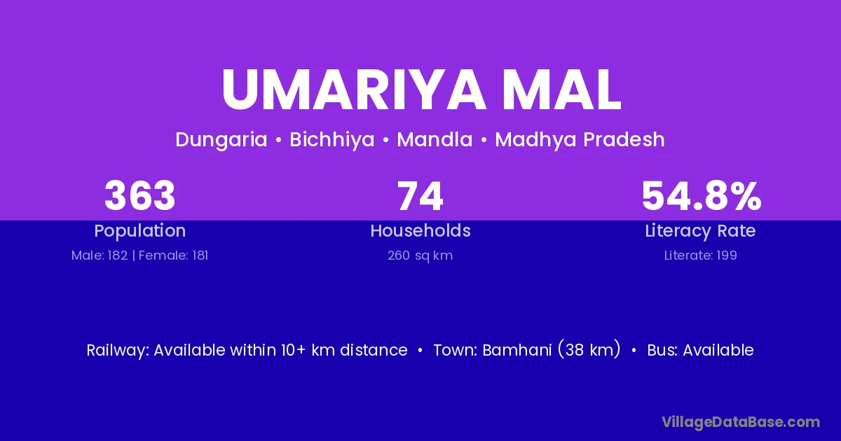 Umariya Mal village has a total population of 363 people, of which 182 are males and 181 are females.