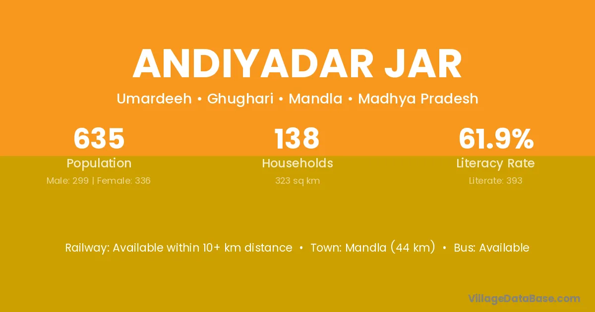 Mandla (44 km) is the nearest town to Andiyadar Jar village for major economic activities and is located approximately 44 km away.