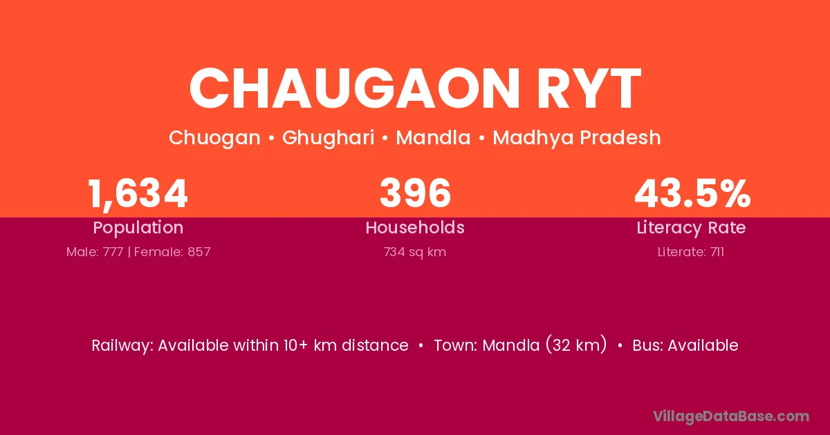 Mandla (32 km) is the nearest town to Chaugaon Ryt village for major economic activities and is located approximately 32 km away.