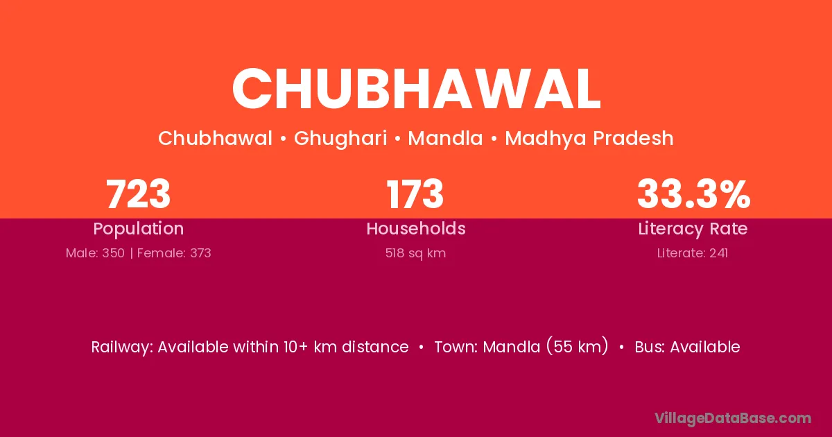 Mandla (55 km) is the nearest town to Chubhawal village for major economic activities and is located approximately 55 km away.