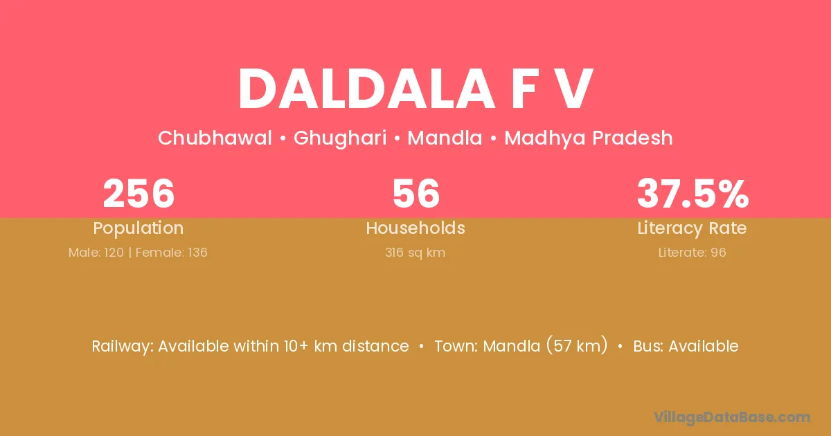 Mandla (57 km) is the nearest town to Daldala F V village for major economic activities and is located approximately 57 km away.