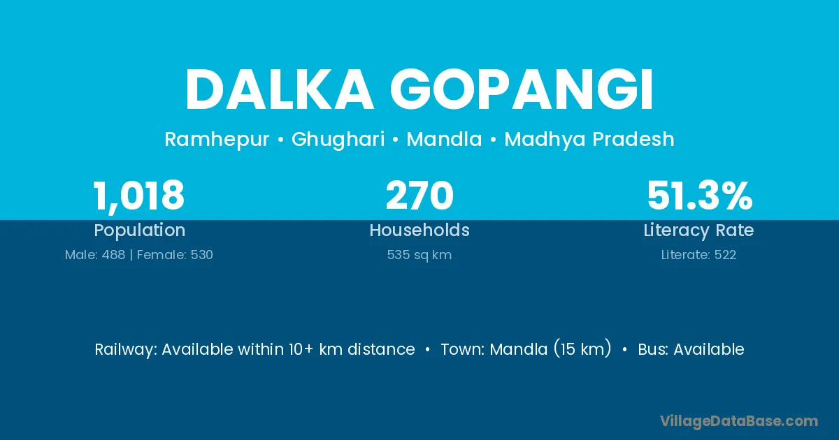 Mandla (15 km) is the nearest town to Dalka Gopangi village for major economic activities and is located approximately 15 km away.