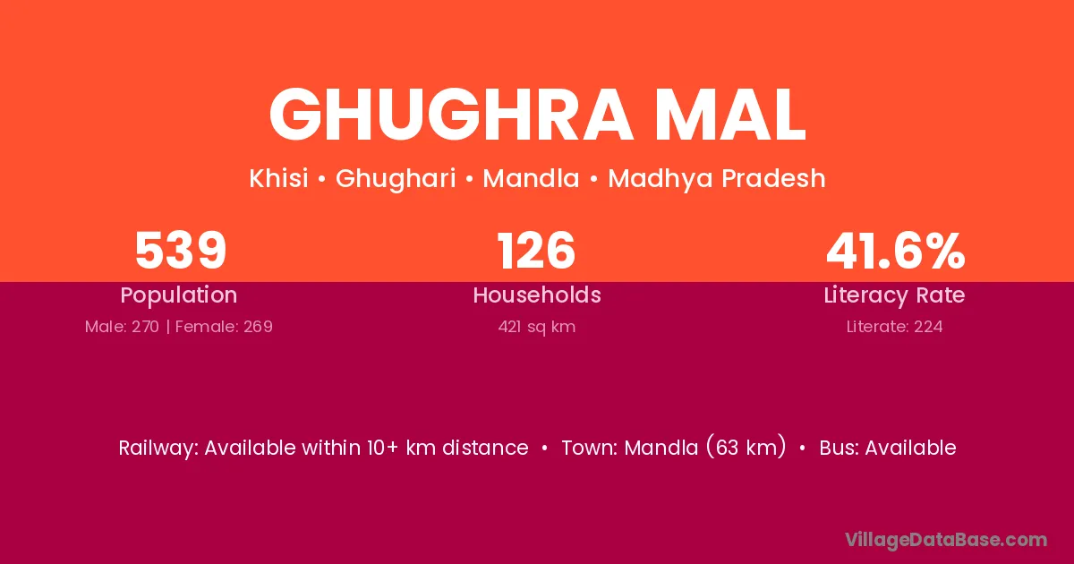 Mandla (63 km) is the nearest town to Ghughra Mal village for major economic activities and is located approximately 63 km away.