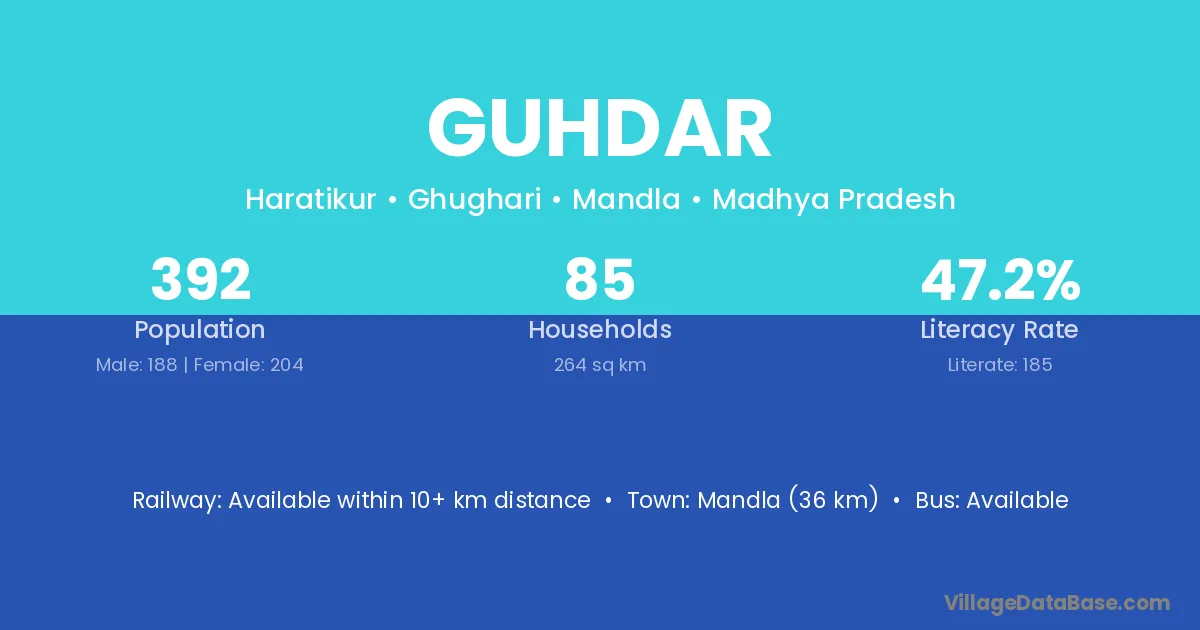 Mandla (36 km) is the nearest town to Guhdar village for major economic activities and is located approximately 36 km away.