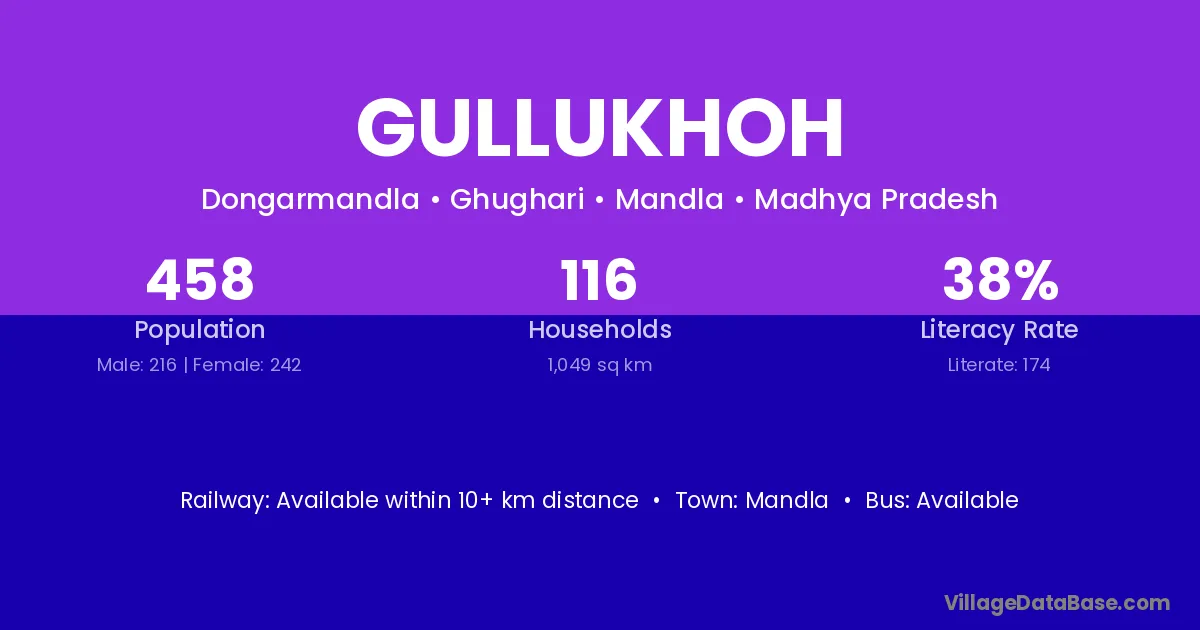 Gullukhoh village has a total population of 458 people, of which 216 are males and 242 are females.