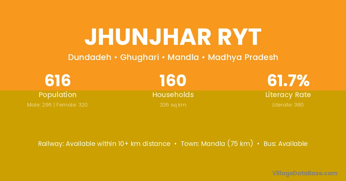 Mandla (75 km) is the nearest town to Jhunjhar Ryt village for major economic activities and is located approximately 75 km away.