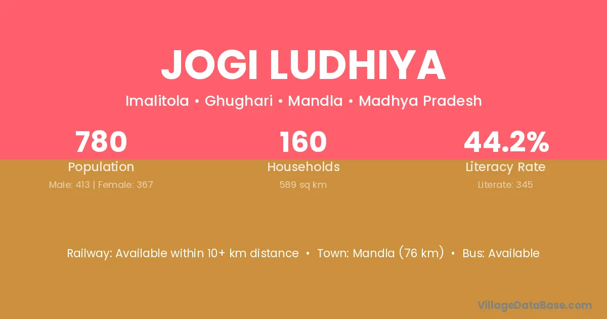 Mandla (76 km) is the nearest town to Jogi Ludhiya village for major economic activities and is located approximately 76 km away.