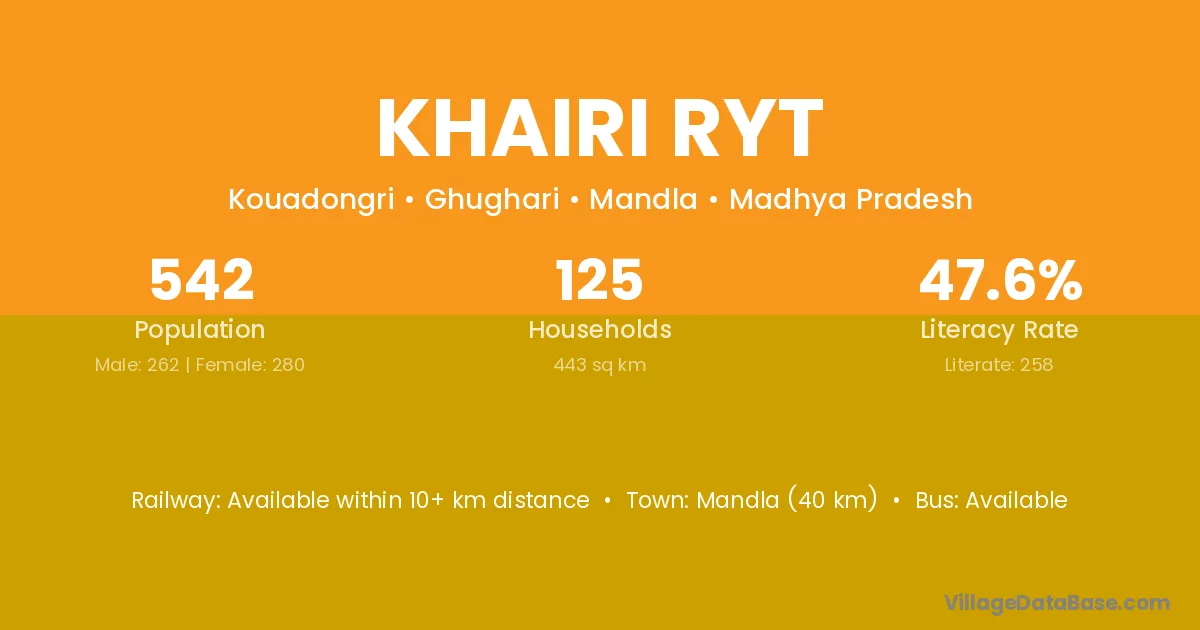 Mandla (40 km) is the nearest town to Khairi Ryt village for major economic activities and is located approximately 40 km away.