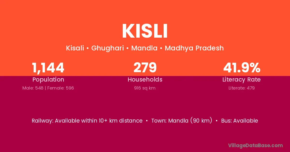 Mandla (90 km) is the nearest town to Kisli village for major economic activities and is located approximately 90 km away.
