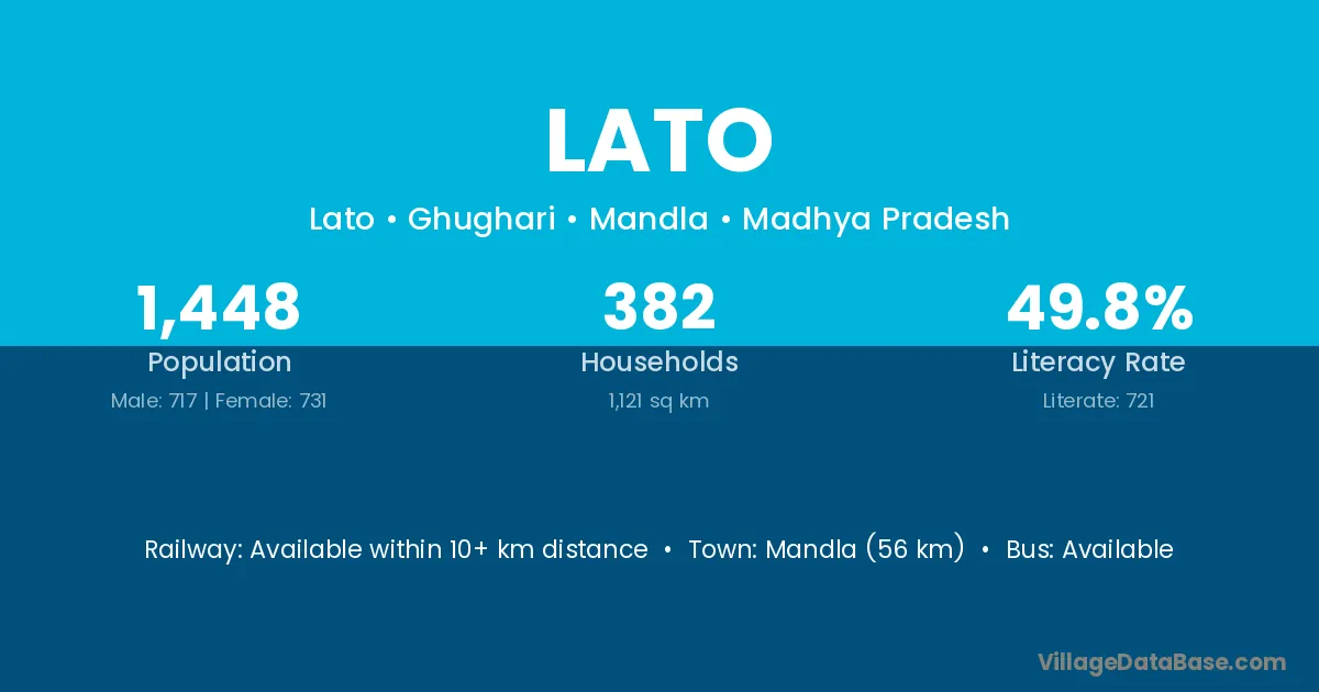 Mandla (56 km) is the nearest town to Lato village for major economic activities and is located approximately 56 km away.
