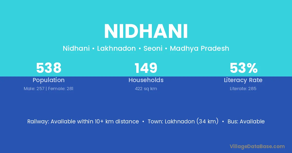 Mandla (36 km) is the nearest town to Nidhani village for major economic activities and is located approximately 36 km away.