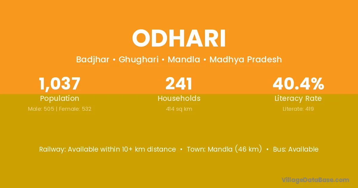 Mandla (46 km) is the nearest town to Odhari village for major economic activities and is located approximately 46 km away.