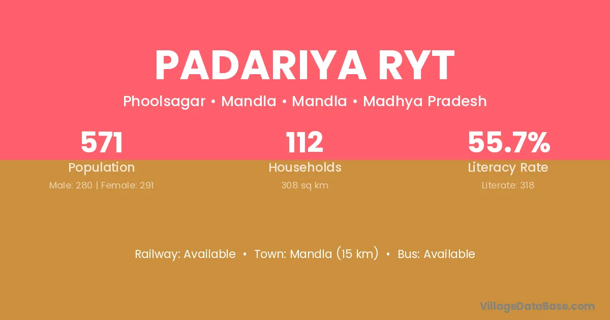 Mandla (34 km) is the nearest town to Padariya Ryt village for major economic activities and is located approximately 34 km away.