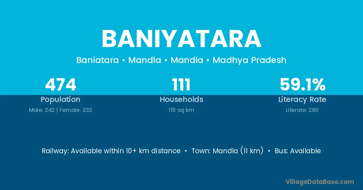Mandla (11 km) is the nearest town to Baniyatara village for major economic activities and is located approximately 11 km away.