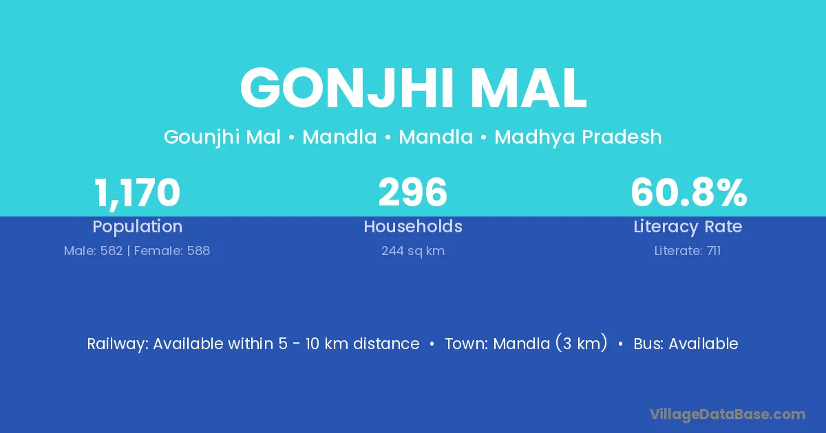 Mandla (3 km) is the nearest town to Gonjhi Mal village for major economic activities and is located approximately 3 km away.