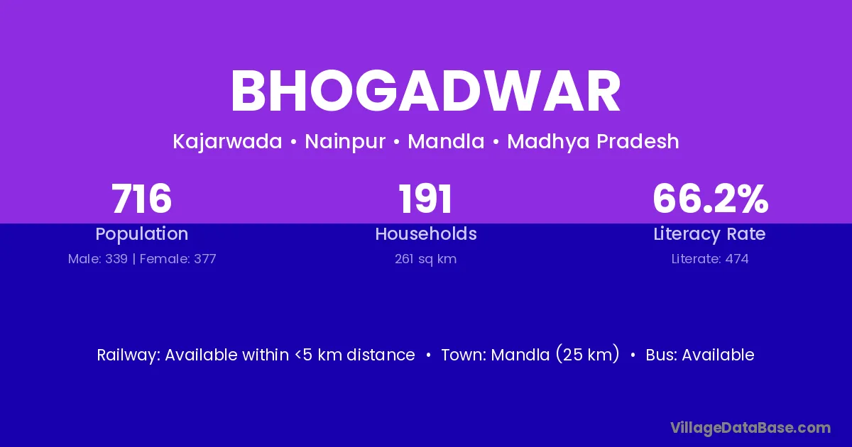 Mandla (25 km) is the nearest town to Bhogadwar village for major economic activities and is located approximately 25 km away.