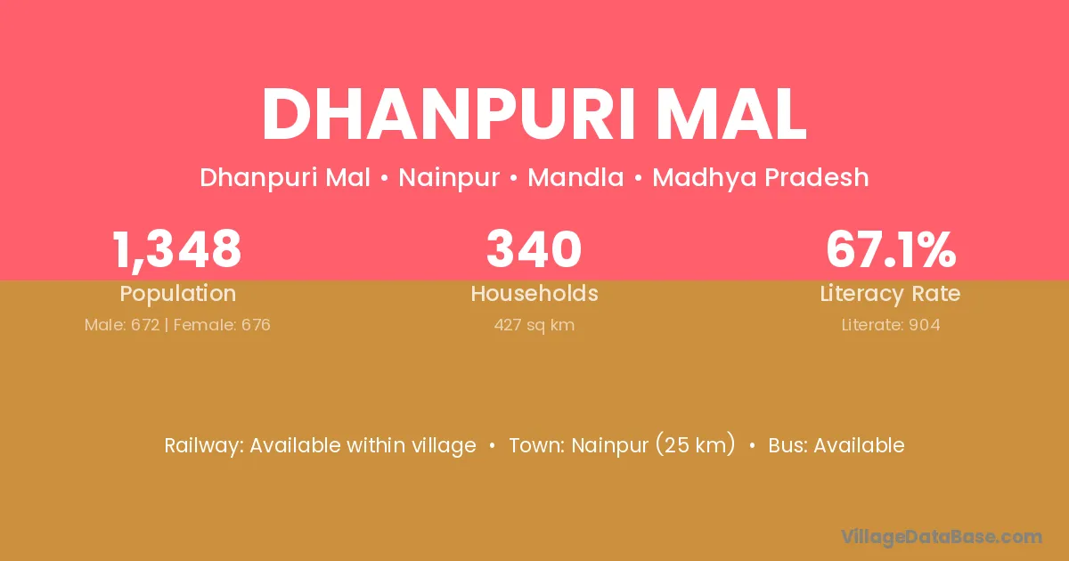 Nainpur (25 km) is the nearest town to Dhanpuri Mal village for major economic activities and is located approximately 25 km away.