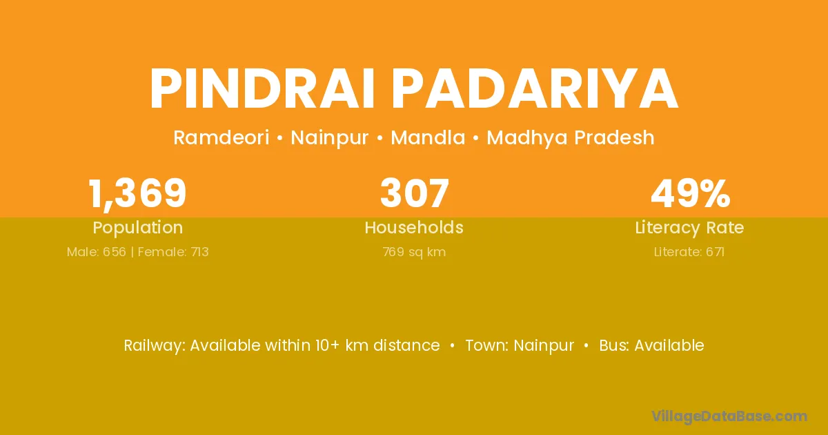 Pindrai Padariya village has a total population of 1,369 people, of which 656 are males and 713 are females.