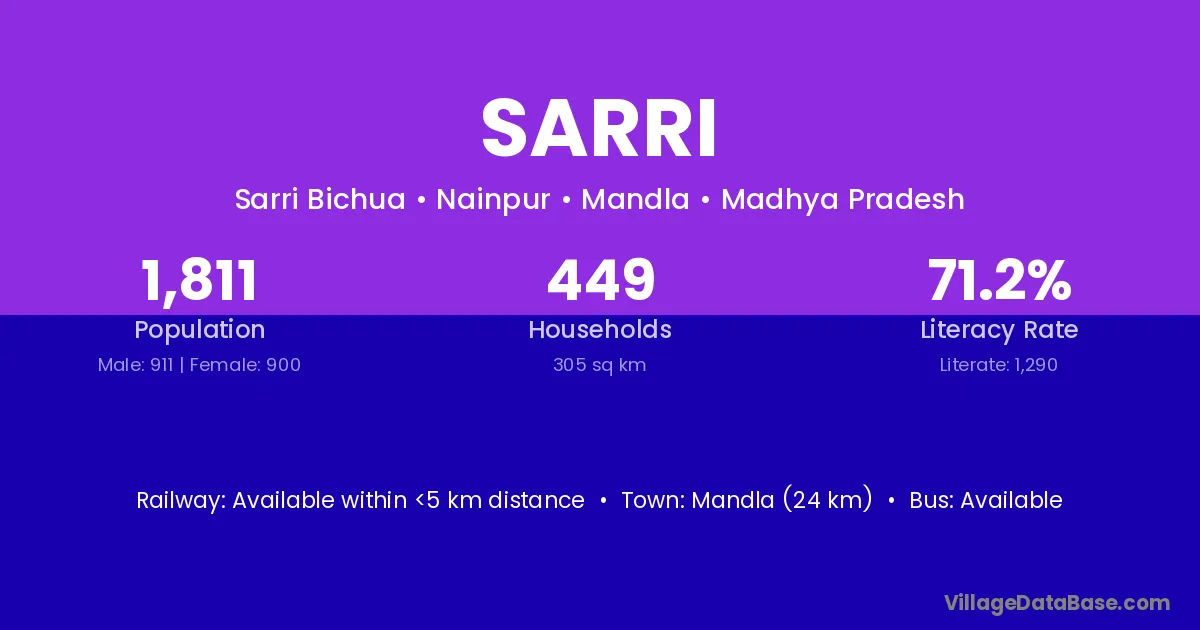 Mandla (24 km) is the nearest town to Sarri village for major economic activities and is located approximately 24 km away.