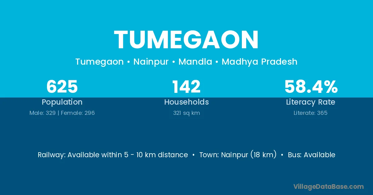 Tumegaon village has a total population of 625 people, of which 329 are males and 296 are females.