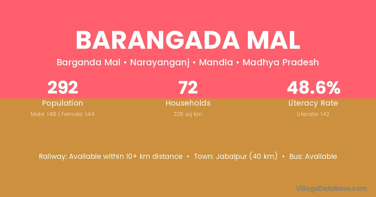 Jabalpur (40 km) is the nearest town to Barangada Mal village for major economic activities and is located approximately 40 km away.