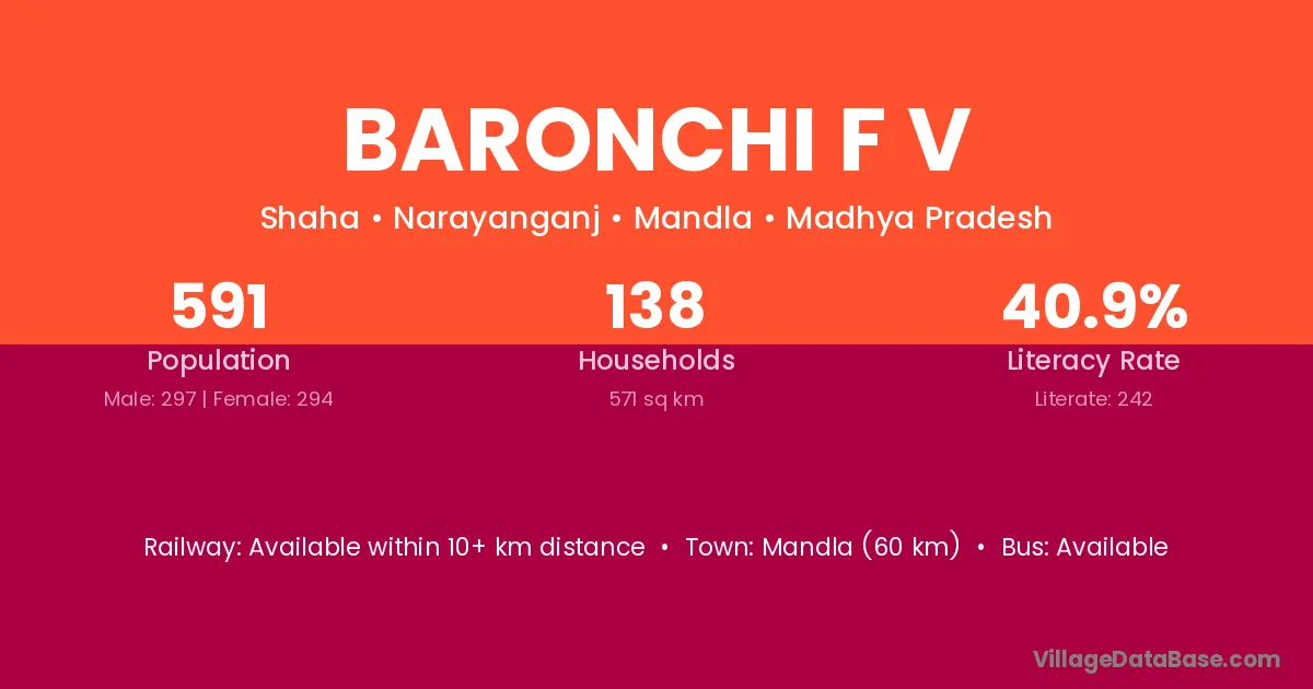 Mandla (60 km) is the nearest town to Baronchi F V village for major economic activities and is located approximately 60 km away.