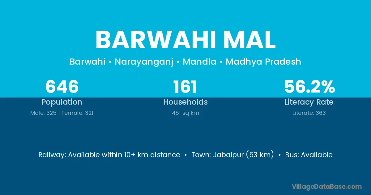 Jabalpur (53 km) is the nearest town to Barwahi Mal village for major economic activities and is located approximately 53 km away.