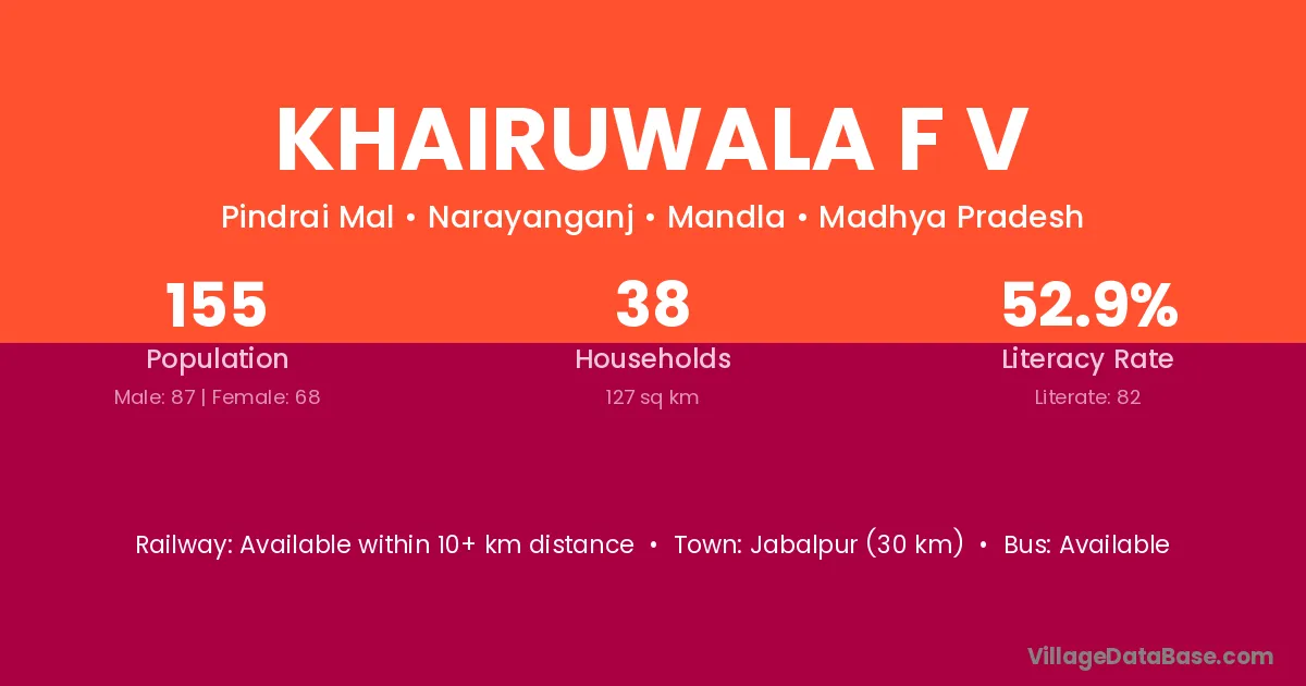 Jabalpur (30 km) is the nearest town to Khairuwala F V village for major economic activities and is located approximately 30 km away.