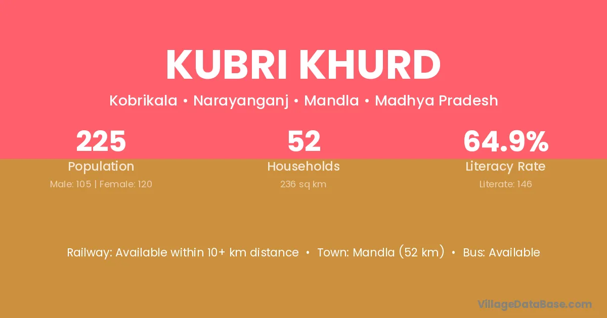 Mandla (52 km) is the nearest town to Kubri Khurd village for major economic activities and is located approximately 52 km away.