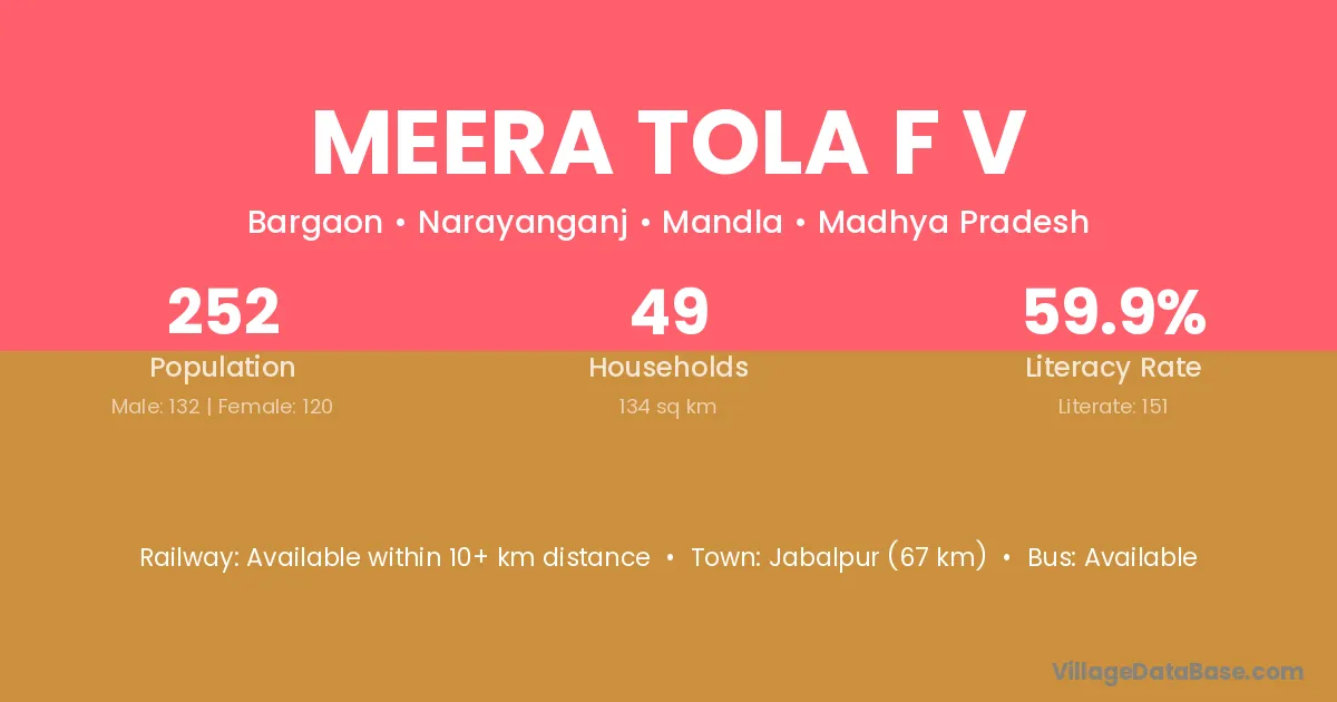 Jabalpur (67 km) is the nearest town to Meera Tola F V village for major economic activities and is located approximately 67 km away.