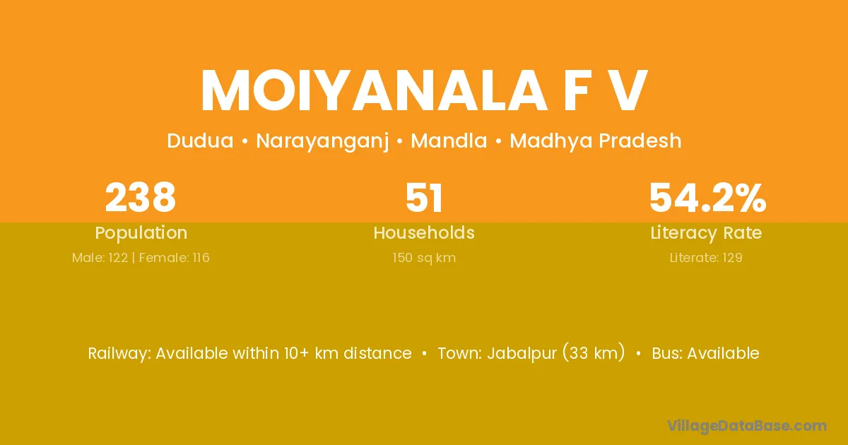Jabalpur (33 km) is the nearest town to Moiyanala F V village for major economic activities and is located approximately 33 km away.