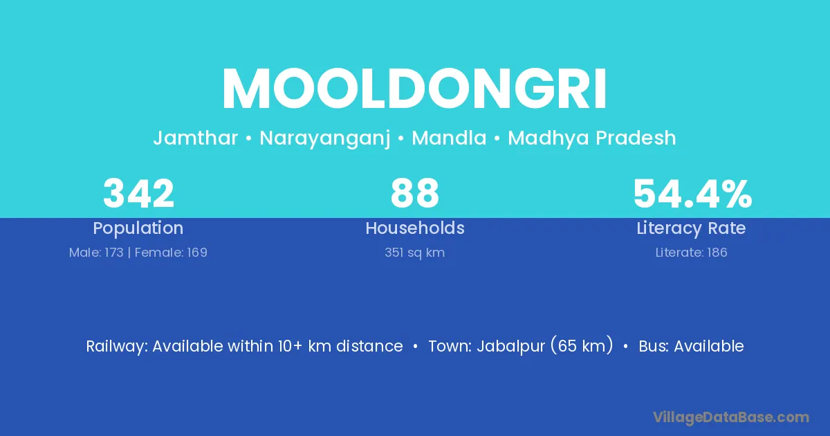Jabalpur (65 km) is the nearest town to Mooldongri village for major economic activities and is located approximately 65 km away.