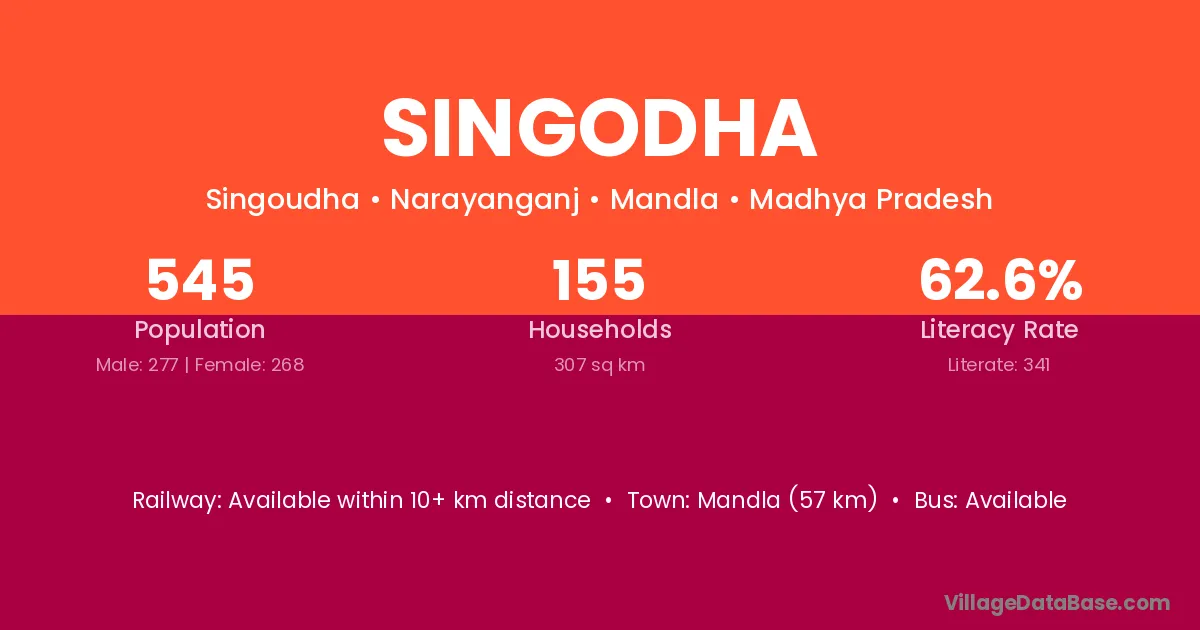 Mandla (57 km) is the nearest town to Singodha village for major economic activities and is located approximately 57 km away.