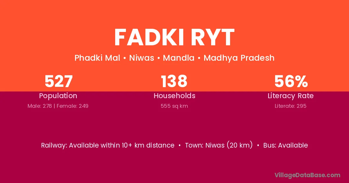 Niwas (20 km) is the nearest town to Fadki Ryt village for major economic activities and is located approximately 20 km away.