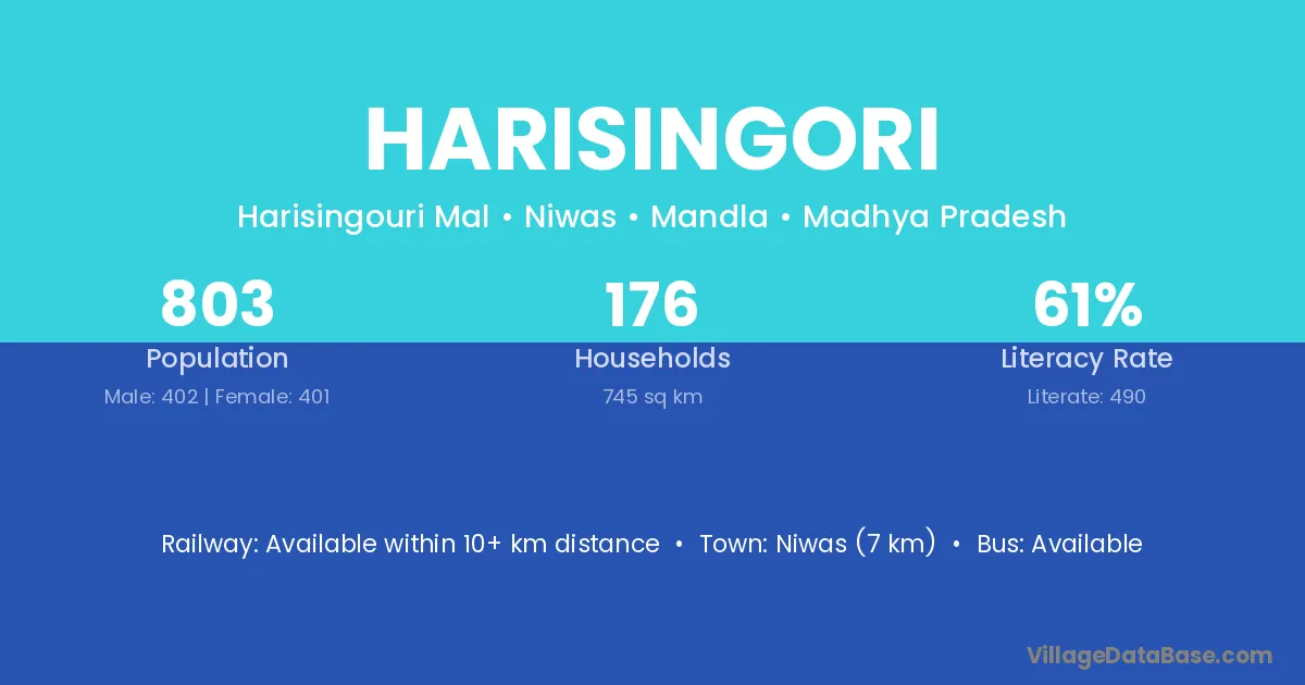 Niwas (7 km) is the nearest town to Harisingori village for major economic activities and is located approximately 7 km away.