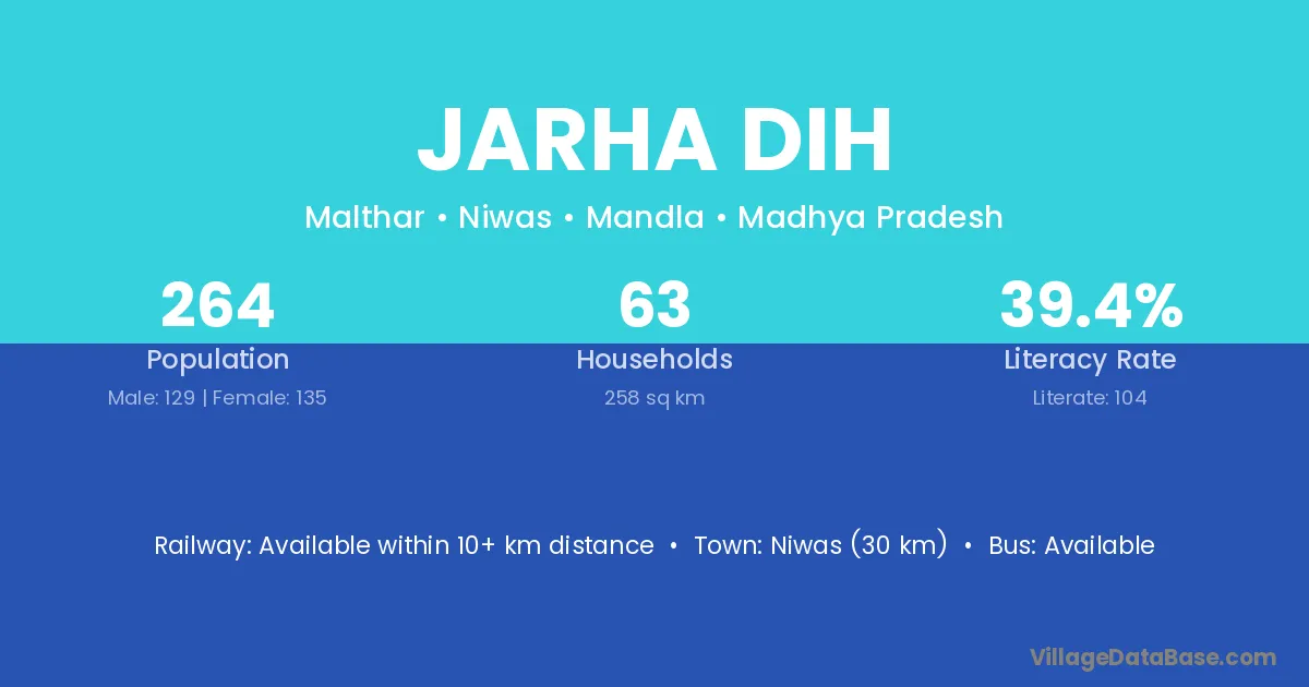 Niwas (30 km) is the nearest town to Jarha Dih village for major economic activities and is located approximately 30 km away.